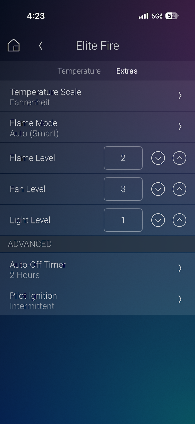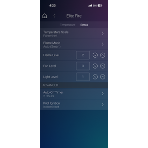 - Auto Smart Flame Mode: Intelligently reaches and holds your desired temperature. Flame level is set automatically based on the difference between temperature setpoint and room temperature.