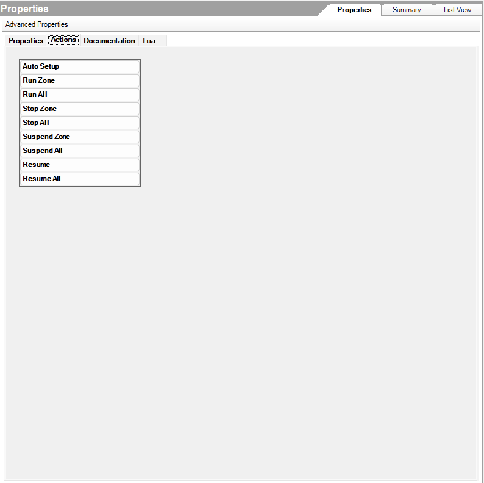 - Driver Actions & Programming Commands - Run Zone, Run All, Stop Zone, Stop All, Suspend Zone, Suspend All, Resume, and Resume All.