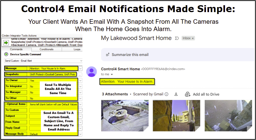 - Improved email delivery during internet outages. The agent will now retry sending emails up to 5 times if the internet is down or the Control4 system fails to send. This enhancement addresses issues on larger projects where